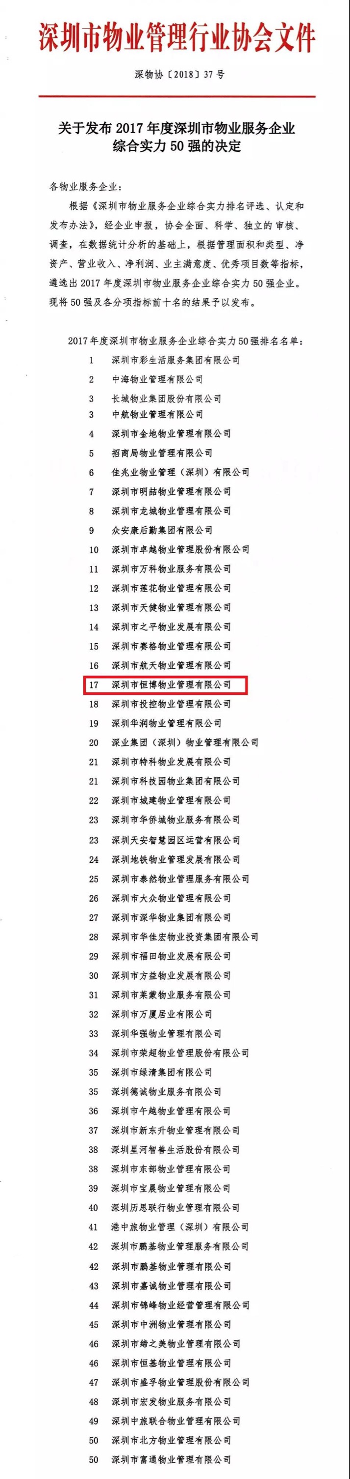恒博物业此次荣获 “2017年度深圳市物业服务企业综合实力50强”  ,排名第17位,非常感谢深圳市物业管理行业协会、合作伙伴以及行业的支持与肯定,恒博物业不忘初心,继续伴随行业成长,并持续不断为行业发展贡献更多力量。